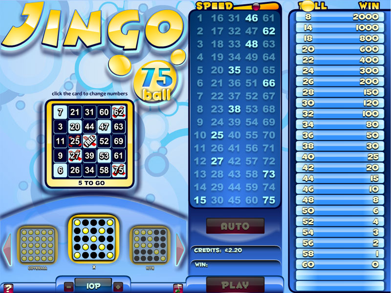 Try our great single player Jingo 90 bingo games and you could pocket yourself a jackpot. In this instant version of bingo your aim is to match your chosen card numbers and pattern, which will also determine the prize value, and bingo in as few calls as possible. The game will draw random numbers as in a real game until you have bingo with your win amount being based on the number of balls it took for you to bingo.